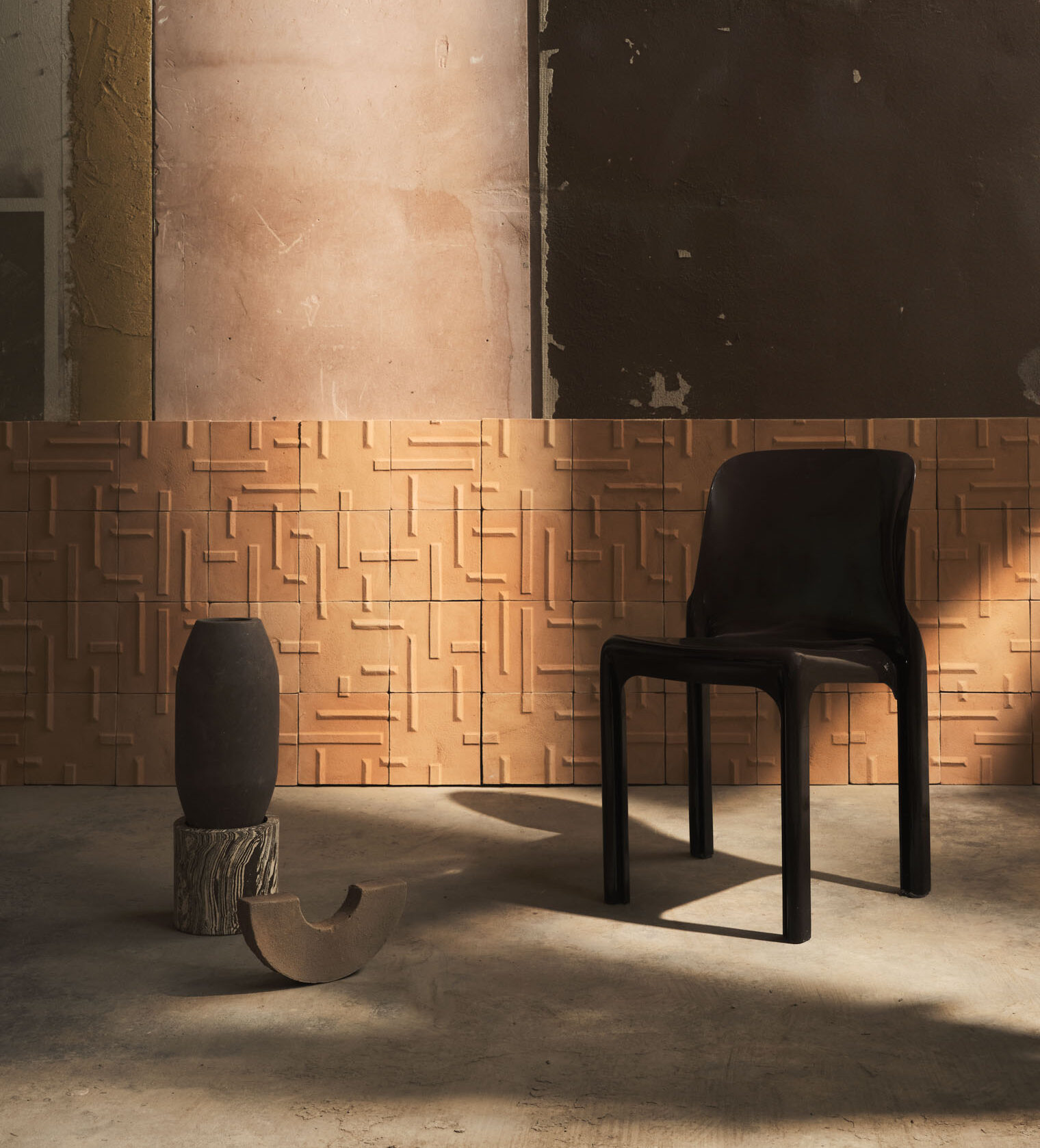 Una sedia nera davanti ad una parete rivestita con piastrelle in terracotta con motivo geometrico, in un ambiente industriale